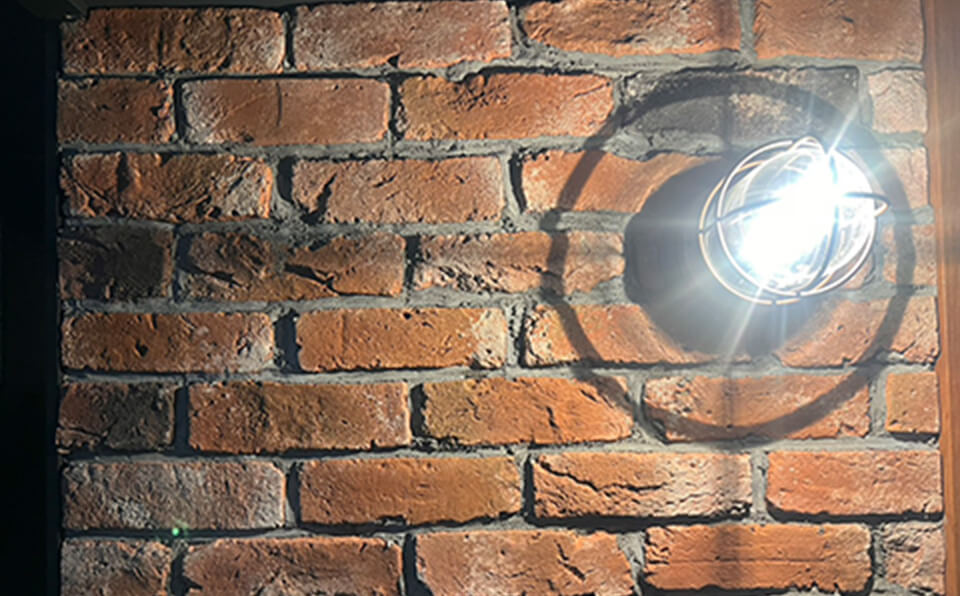 現しの梁に、一面ブリックを貼った壁。